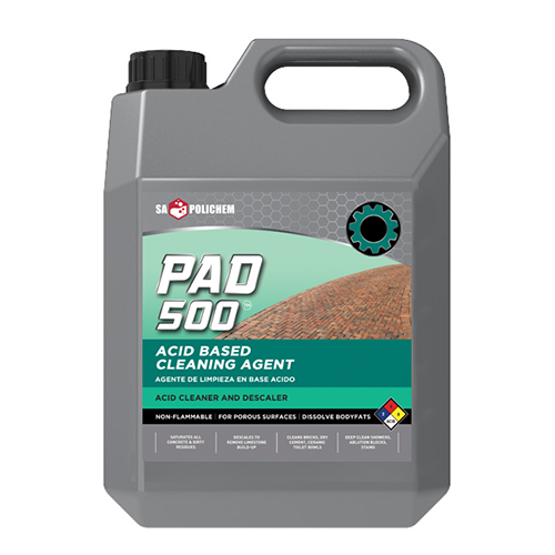 PAD-500 is a powerful acidic cleaning agent and descaler for porous surfaces. It contains an effective blend of acids that can be used for the following applications: cleaning bricks, dry cement, grouting, concrete floors, concrete residues from steelwork, and cleaning cement making equipment. Can also be used for cleaning ceramic toilet bowls, as a limescale remover and to deep clean showers and ablution blocks. For removing stains from ceramic tiles and other porous surfaces.